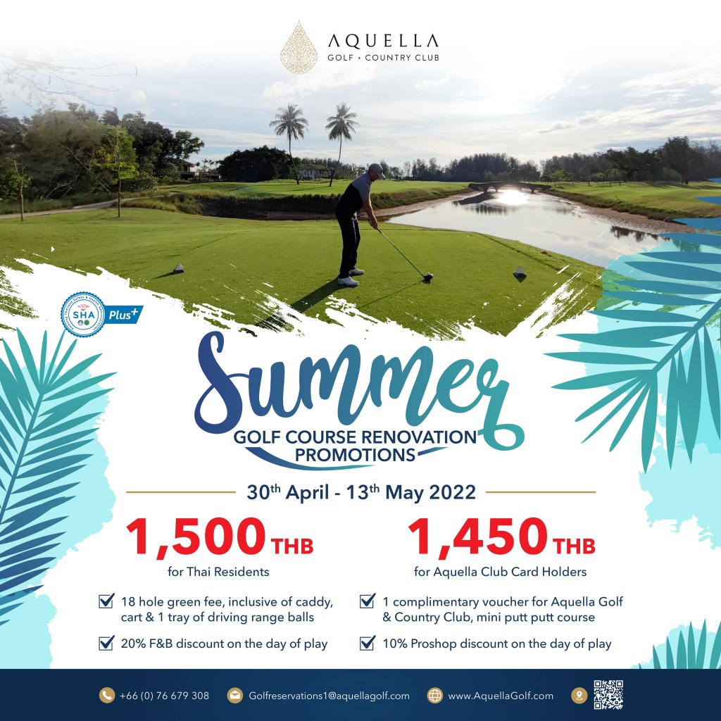 สนามอะเควลล่า กอล์ฟ แอนด์ คันทรี คลับ ได้ทำการบำรุงรักษาสนามประจำปีตลอดสัปดาห์ที่ผ่านมาเพื่อพัฒนาคุณภาพสนามให้ดียิ่งขึ้นกว่าเดิม จึงขอเชิญชวนนักกอล์ฟออกมารับลมทะเลและสนุกกับการออกรอบช่วงซัมเมอร์พร้อมรับโปรโมชันสุดพิเศษตลอดช่วงการฟื้นฟูความสมบูรณ์ของพื้นหญ้า ระหว่างวันที่ 30 เมษายน ถึง 13 พฤษภาคม 2565 สำหรับผู้พำนักอยู่ในประเทศไทยออกรอบราคาเพียง 1,500 บาท (รวมกรีนฟี แคดดี้ รถกอล์ฟระบบ GPS และลูกซ้อมไดร์ฟ 1 ถาด) และผู้ถือบัตรอะเควลล่า คลับการ์ด เพียง 1,450 บาท