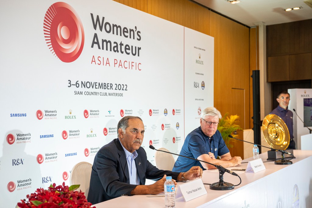 ไทมูร์ ฮัสซัน อามีน ประธานสมาพันธ์กอล์ฟเอเชียแปซิฟิก และ มาร์ติน สลัมเบอร์ส หัวหน้าผู้บริหารของอาร์ แอนด์ เอ เผยความพร้อมจัด WAAP 2022